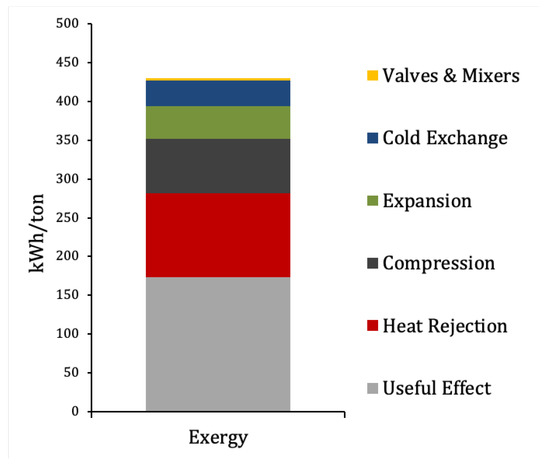 The ratio between the minimum and the optimum SPC gives the exergy efficiency of the process, 40.3%. The remaining 59.7% corresponds to exergy destruction taking place in the different units. Figure 10 offers a detailed exergy breakdown of in absolute value (kWh/ton) per equipment type. Figure 11 shows the exergy destruction distribution per component in %.