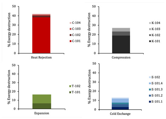 An interesting remark can be made regarding the cold exchange in both cycles. Nitrogen reaches a minimum temperature of approximately 70 K in the process, while helium descends up to just over 4 K. As it was mentioned, the exergy destruction caused by any inefficiency is greater the lower the temperature, which would greatly penalise helium. According to the authors of [9], however, exergy destruction in the heat exchange for helium is approximately 10% and here it amounts to approximately 8%, which does not appear to be proportional to the difference in temperature. This can be explained by the better match of the temperature profiles for the case of helium, especially at E-101.4, which was commented in Section 3.1.