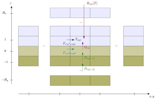 A climate model is usually a discretization of atmosphere and ground (ocean or land) into boxes that exchange mass, momentum, and energy. Atmospheric models explicitly represent these exchanges, with parameterizations for the representation of the small scales’ motions. Energy balance models are only based on the energy budget equation. We represent the climate system by boxes where is the number of atmospheric boxes in each vertical column, is the number of ground boxes in each vertical column and is the number of boxes in each horizontal layer. The position of a box is indexed by its discrete position . The layer corresponds to the thin surface of the ground that is radiatively heated/cooled.