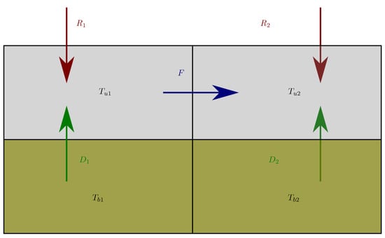 To analyze the physical relevance of MEP hypothesis and get insights into the effect it has on the represented variables, it is instructive to consider the model with only four boxes shown in Figure 2. It represents two columns of two layers. The upper boxes represent the part of the system that is forced radiatively (typically the troposphere and the thin ground surface) by source terms . They can exchange energy by a “turbulent” heat flux that will be optimized with MEP. We note their temperature . The two bottom boxes represent buffers of energy that store/release energy by conduction to the upper boxes (typically the ground). We note their temperature . , F and are expressed in W. We consider a local radiative forcing (i.e., that depends only on the box temperature and external parameters), which is, of course, over-simplistic for a true atmospheric column, but allow for useful simplifications. Furthermore, one assumes that the radiative forcing can be linearized around a temperature that physically represents the radiative equilibrium solution of the problem (i.e., the temperature of the upper box in the absence of thermal inertia, no convective fluxes and no diffusive heat fluxes ). The linearization around assumes that the temperatures stay close to the radiative equilibrium solution. In this toy model, the atmosphere is reduced to only one layer (that even includes the surface layer). However, for models with several atmospheric layers and a realistic description of the radiative forcing, the radiative equilibrium temperatures are not the same for all the boxes. The radiative forcing then reads