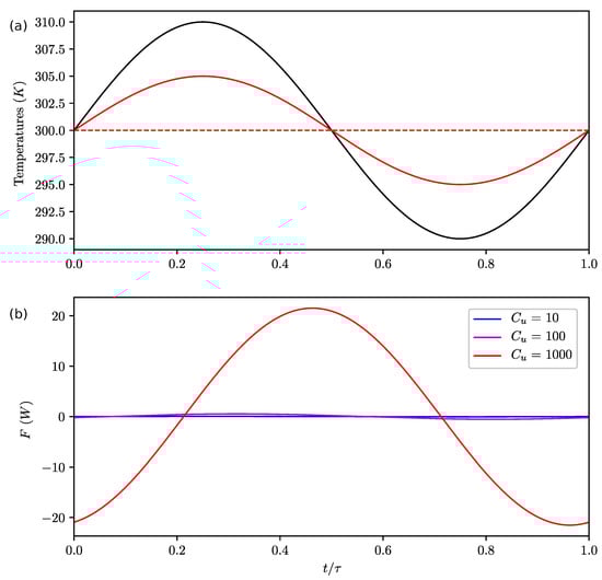 To illustrate this point, we show the temperatures and the energy flux during the cycle for a typical case when and with various values of in Figure 3. We observed that there was almost no lag of the upper boxes temperatures, even if we increased by several orders of magnitude as in []. That is quite unexpected in a real system since the heat capacity naturally controls the thermal inertia of a system. It is explained here by the fact that the energy flux F which maximizes the entropy production adjusts with the change of the heat capacity such that we do not observe a lag. It means that the energy storage (and hence the induced lag) cannot be represented with the MEP hypothesis alone.