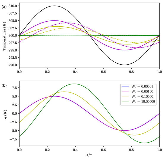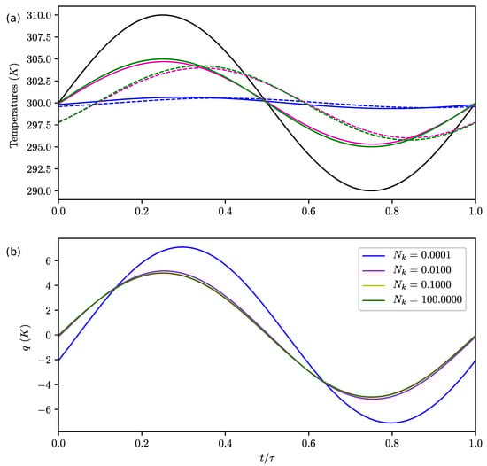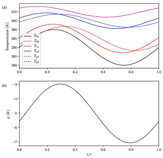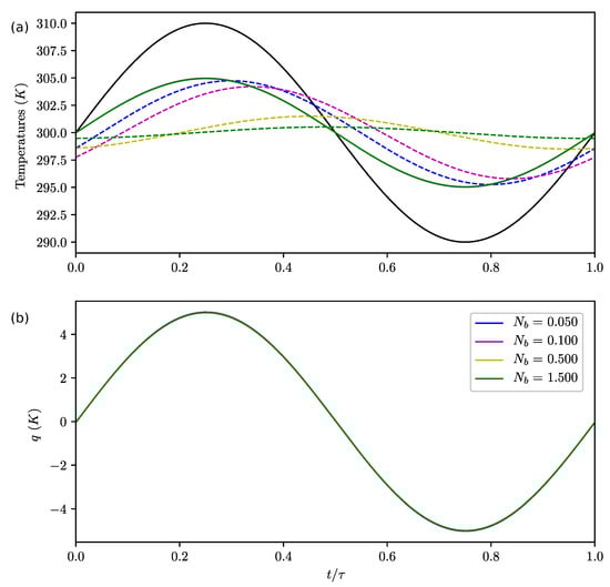 We clearly observe in Figure 4a that controls the lag and amplitude of the bottom temperature (with respect to the upper box). This parameter does not significantly affect the upper box temperature (Figure 4a,b) nor q. As increases, the amplitude of decreases and its lag increases. This is a classical behavior for diffusion. When is finite (i.e., ), a local lag is naturally introduced, giving a more satisfactory temperature response than in []. q is not influenced by .