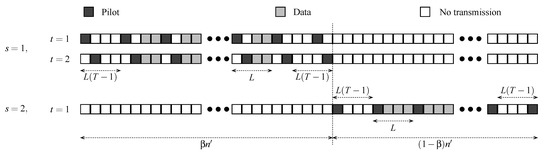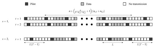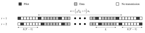 Assuming that transmission from both users is synchronized, the transmission scheme extends the point-to-point setup in Section 2 to the two-user MAC setup as illustrated in Figure 3. Every L time instants (for some ), user 1 first transmits the pilot vectors . Once the transmission of the pilot vectors ends, user 2 transmits its pilot vectors . The codewords for both users are then split up into blocks of data vectors, which are transmitted simultaneously after the pilot vectors. The process of transmitting data vectors and pilot vectors continues until all n data symbols are completed. Herein we assume that n is an integer multiple of . (As in the point-to-point setup, in the limit as n tends to infinity, this assumption is not critical in terms of achievable rates.) Prior to transmitting the first data block, and after transmitting the last data block, a guard period of time instants (for some ) is introduced for the purpose of channel estimation, where we transmit every L time instants the pilot vectors but we do not transmit data vectors in between. Please note that codewords from both users are jointly transmitted at the same time instants whereas pilots from both users do not interfere and are separately transmitted at different time instants. The total blocklength of this transmission scheme (comprising data vectors, pilot vectors, and guard period) is given by