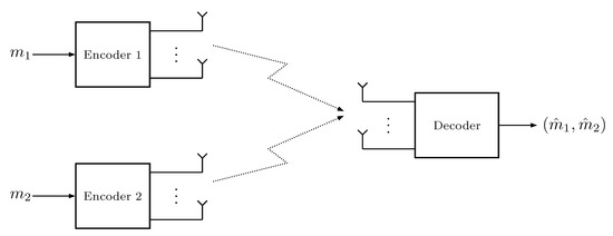Here denotes the time-k channel input vector corresponding to user s, ; denotes the -dimensional fading matrix at time k corresponding to user s, ; denotes the average SNR for each transmit antenna; and denotes the -variate additive noise vector at time k. The fading processes , are independent of each other and of the noise process and have the same distribution as the fading process considered in the point-to-point channel (Section 2). The noise process is a sequence of i.i.d. complex-Gaussian vectors with zero mean and covariance matrix .