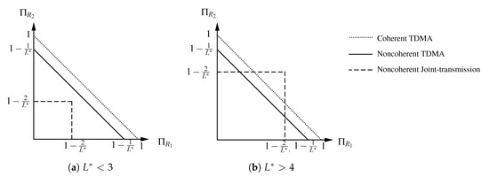 We shall compare the joint-transmission scheme with a time-division multiple-access (TDMA) scheme, where each user transmits its message using the transmission scheme illustrated in Figure 4. Specifically, during the first channel uses (for some , and where is given in (41)), user 1 transmits its codeword according to the transmission scheme given in Section 2 (see also Figure 4), while user 2 is silent. Then, during the next channel uses, user 2 transmits its codeword according to the same transmission scheme, while user 1 is silent. In both cases, the receiver guesses the corresponding message , using a nearest neighbor decoder and pilot-aided channel estimation.