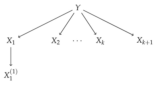 The above model generalizes the model discussed in Reference [3], but some branches which are irrelevant in our considerations are omitted. The values of conditional mutual information in the model, where for different as a function of k are shown in the Figure 3. We prove in the following that ; thus, carries non-null predictive information about Y even when variables are already chosen as predictors. We note that for every and containing . Thus, is the Markov Blanket (cf., e.g., Reference [22]) of Y among predictors and is sufficient for Y (cf. Reference [23]). A more general model may be considered which incorporates children of every vertex , and several levels of progeny. Here, we show how one variable which does not belong to Markov Blanket of Y is treated differently by the considered selection rules.