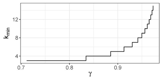 The minimal k for which the JMI criterion incorrectly chooses , i.e., the first k for which (35) holds, is shown in Figure 4. The values of JMI criterion for variables and is shown in Figure 5. Figure 4 indicates that is chosen early; for , it happens in the third step at the latest.