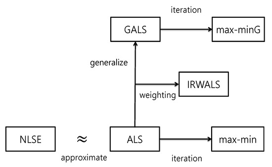 Schematic flow chart related to the proposed methods: Nonlinear least squares estimation (NLSE), approximated nonlinear least squares (ALS), iteratively re-weighted approximated nonlinear least squares (IRWALS), generalized approximated nonlinear least squares (GALS), max-min algorithm, and generalized max-min algorithm (max-minG).