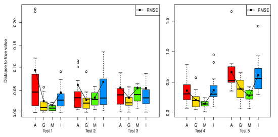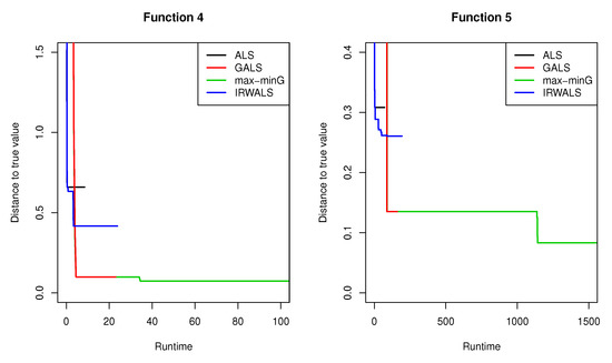 This is also confirmed in Figure 2 which shows the boxplot of distance to true value with the RMSE for the five test functions. The details are shown in Figure A1, Figure A2, Figure A3, Figure A4 and Figure A5, where the last boxplots show the distances between the estimates and true values, and the other boxplots show estimates with true values (horizontal solid line). In most cases, the medians of the estimates obtained from the GALS and max-minG are closer to the true values than those from the ALS and IRWALS. Furthermore, the box lengths of the estimates obtained from the GALS and max-minG are shorter than those from the ALS and the IRWALS. From the boxplot of the distances between the estimates and true values, it is also confirmed that the GALS and max-minG give more accurate and stable (shorter box lengths) results in overall.