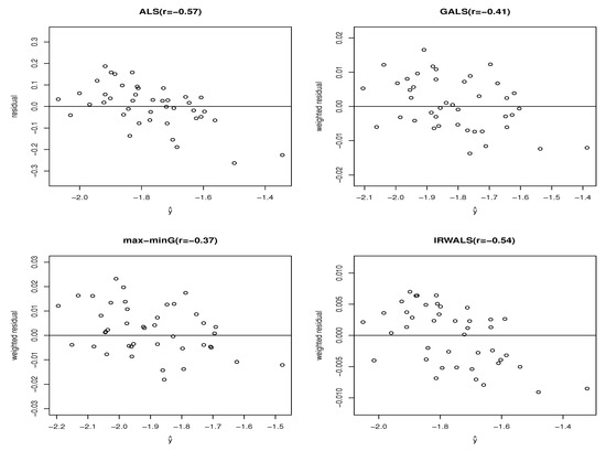 Figure 4 shows the residuals (), weighted residuals (, and ) according to the predited values . The residuals from the ALS show a pattern of declining as increases. Whereas the abnormal pattern in the weighted residuals from the GALS and the max-minG is hardly observed. It can be confirmed via the Pearson correlation coefficient between the residuals (or the weighted residuals) and the predicted values from each method in Figure 4. The correlation coefficient, which was −0.57 on the ALS, barely changed to −0.54 on the IRWASL, but significantly changed to −0.41 and −0.37 on the GALS and max-minG, respectively.