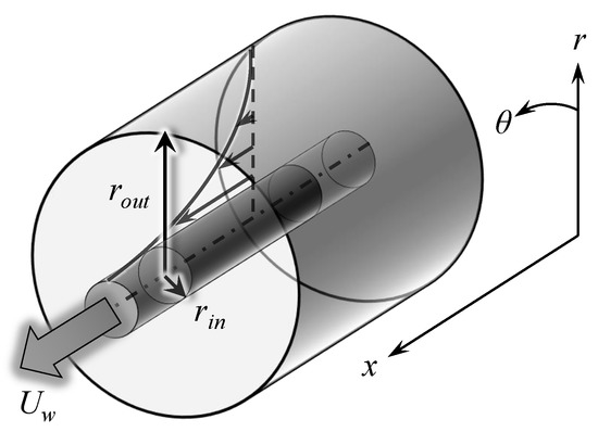 Annular Couette flow is the flow in the interstice between two coaxial cylinders of formally infinite length, driven by the motion at velocity of the inner cylinder in the x-direction. The annular geometry of this flow is common to both Taylor–Couette flow and annular Pipe flow; however, the forcing is different and no spin of the walls is considered. A sketch of that geometry is displayed in Figure 1 with the usual notations for the cylindrical coordinates . Assuming that the inner and outer cylinder have respective dimensional radii and , the main geometrical parameter of this study is the radius ratio , which varies in the open interval . We also introduce the gap h between the two cylinders .