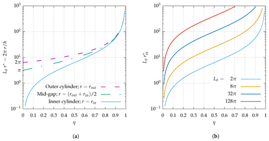 Like in other wall-bounded shear flows, the main lengthscale ruling out the transitional dynamics at onset is the gap h between the two solid walls, which here depends directly on the value via the relation . The perimeter on the internal cylinder, at mid-gap or on the external cylinder, now expressed in units of h, is shown in Figure 2 when the original dimensional value of is (Figure 2a). The inner perimeter is also displayed when is a multiple of (Figure 2b), with . The theory developed in Refs. [33,36] shows that azimuthal large-scale flows cannot be accommodated by the geometry unless everywhere in the domain. The data for the inner cylinder play the role of a lower bound. For , it is clear from Figure 2a that, for the lowest values of , no azimuthal large-scale flow is possible. However, increasing n leads to azimuthal large-scale flows being possible for smaller and smaller values of . This leads to the possibility to artificially restore large-scale flows otherwise ruled out by geometrical confinement.