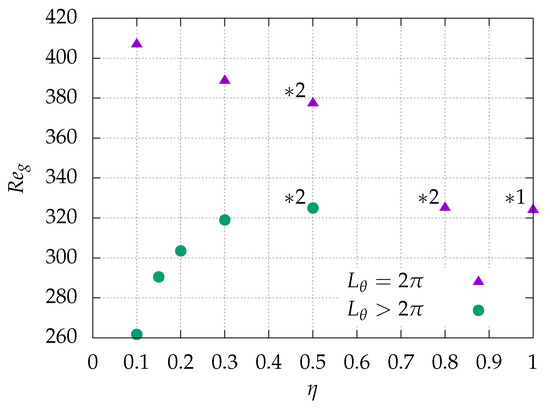 Radius ratio dependency of the global critical Reynolds number . The plot includes the pCf limit from Ref. [21] (labeled “*1”), as well as DNS data from Ref. [36] for and 0.8 (labeled “*2”). Triangles: original aCf with is plotted using triangles; circles: artificially extended aCf ().