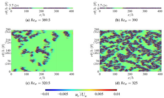 The fact that artificially extended systems display a lower threshold in indicates that some specific spatiotemporal regimes, specific to large and not allowed for in narrow domains, are able to maintain themselves against relaminarization. As in Ref. [36], we can compare typical snapshots of the velocity fields in the corresponding regime in order to highlight the qualitative differences. Figure 4 and Figure 5 display instantaneous snapshots of the radial velocity at mid-gap (i.e., ) at respectively and 0.1, one very close to (left column) and the other slightly above it (right column). Each row corresponds to a different value of the integer n (n = 1, 16, 48, and 64), i.e., another value of . When , the one-dimensional intermittency is reminiscent of the dynamics in cylindrical pipe flow [40]. The differences between different values of emerge only for higher n. For , the stripe patterns exhibit an obliqueness typical of most laminar-turbulent patterns [25,26,37,41]. However, it is visually clear that the situation is different for , with shorter structures and less pronounced obliqueness. It is not immediately clear whether the effective dimensionality of the proliferation process is rather one or two. These issues can be addressed using the determination of critical exponents, as will be done in the next subsection.