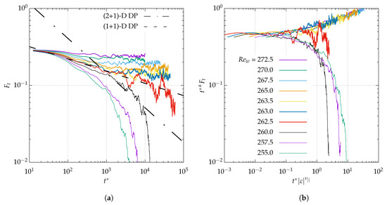 Critical quenches from to each Reynolds number. Temporal variation of turbulent fraction for and (log-log scale). In (a), the black dashed-dotted line and dashed line each indicate possible algebraic fits with the dynamic exponent from (2 + 1)-D and (1 + 1)-D directed percolation (respectively = 0.451 and 0.159). See also Supplementary; (b) test of the 1D scaling hypothesis by plotting vs. (log-log scale), with =1.733 for (1 + 1)-D DP.