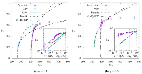 As a by-product of Figure 7, the values of the mean turbulent fraction , obtained after reaching equilibrium, are reported in Figure 8 as functions of . Critical theories all predict a scaling close enough to the critical point. The algebraic scaling revealed in the previous plots of critical quench suggests that, for instance, belongs to the range where algebraic fits apply for and . Consequently, if, for these parameters, is defined using the approximated , the dependence of versus is also expected to be algebraic in the same range of values of . In that case, the power-law exponents can be classically estimated using log-log plots and compared to those from DP theories. Algebraic fits of are shown in Figure 8 both for (left) and (right). For each case, the main plot of versus is displayed in linear coordinates, while the inset displays versus in log-log coordinates, in order to highlight the quality of the estimation of the power-law exponent.