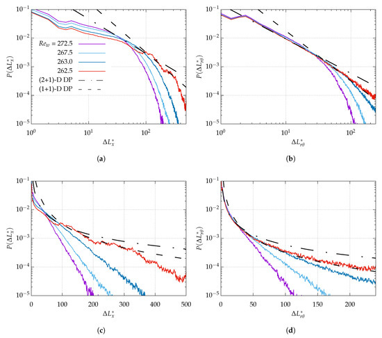 Time-averaged distributions of laminar gap in (a,c) the streamwise direction and (b,d) the azimuthal direction, evaluated at mid-gap. (a,b) log-log plots vs. (c,d) lin-log plots. , as in Figure 5e,f. In both figures, black dashed-dotted line (- · -) and dashed lien (- - -) indicate theoretical distributions with exponents from the universality classes of (2 + 1)-D DP and (1 + 1)-D DP, respectively, i.e., , and .