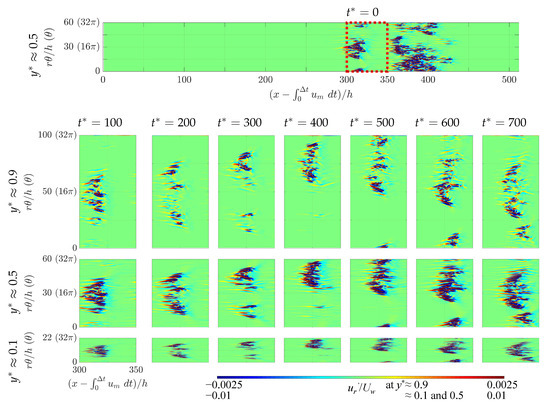 In this last subsection, we address the issue of the influence of azimuthal confinement/extension on the lower transition threshold , as the estimations from Figure 3 suggest. In Ref. [36], a similar trend was noted (from measurements in shorter and narrower domains). The mechanism suggested in this former work addressed the presence of oblique stripes rather than their influence on the value of . It was thereafter realized that the phenomenon governing the value of , and by extension all statistics of the turbulent fraction, is the way different coherent structures interact together dynamically rather than the shape of such individual structures (although that shape certainly influences the interactions). In analogy with pipe [16,42,43] and channel [44,45], the finite turbulent fraction is the result of a dynamical competition between the proliferation of coherent structures and their tendency to decay in number. The transitional range where is dominated by the splitting of coherent structures, whereas instantaneous relaminarizations become rare. We hence focus on the dynamics of splitting events in two different computational domains, namely those with and . Figure 10 contains zooms on the radial velocity plotted for different values of surfaces (a different value for each row) and for different times (different columns). In Figure 10, the value of is fixed to , but the circumference in terms of varies according to r. The global dynamics of these flows can also been scrutinized in the videos made available as Supplementary Materials. The comparison of different values of y is useful to confirm that, for all parameters, the spots remain coherent over the gap even during splitting events.