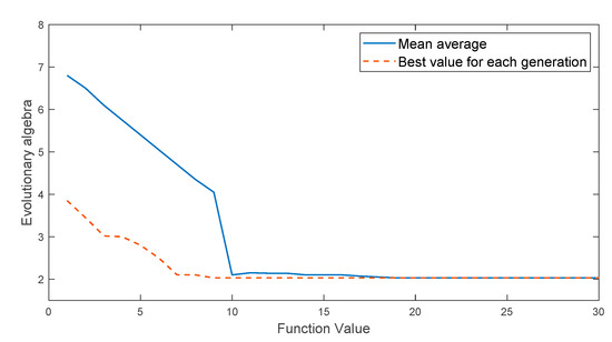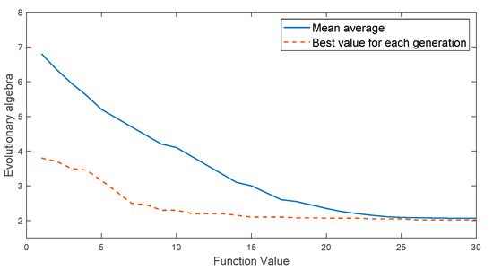 In this simulation experiment, expression (9) is regarded as the fitness function of genetic algorithm and multi-island genetic algorithm. For genetic algorithms, the number of iterations is 30, the population size is 100, the crossover probability is 1, and the mutation probability is 0.01. For the multi-island genetic algorithm, the initial population is divided into 10 islands, the population number of each island is set to 10, the number of iterations is 30, the crossover probability is 1, the mutation probability is 0.01, the migration probability is 0.01, and the number of elite individuals is 1. The iterative curve of the optimization process is shown in Figure 1 and Figure 2.
