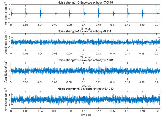 Figure 3 shows the waveforms of the simulation signal under the conditions of no noise, noise intensity = 1, noise intensity = 3, and noise intensity = 5, respectively. By comparing the four pictures, we can see that the periodic pulses in the simulation signal are completely covered by strong noise. There is a positive proportional relationship between the intensity of noise and envelope entropy: as the noise becomes stronger, the periodic pulse becomes blurred and the envelope entropy increases; with the weakening of noise, the periodic pulse becomes prominent and the envelope entropy becomes smaller. This also proves the law that the greater the sparsity of the signal, the smaller the envelope entropy. Therefore, the modal component with minimum envelope entropy can be identified as the optimal component.