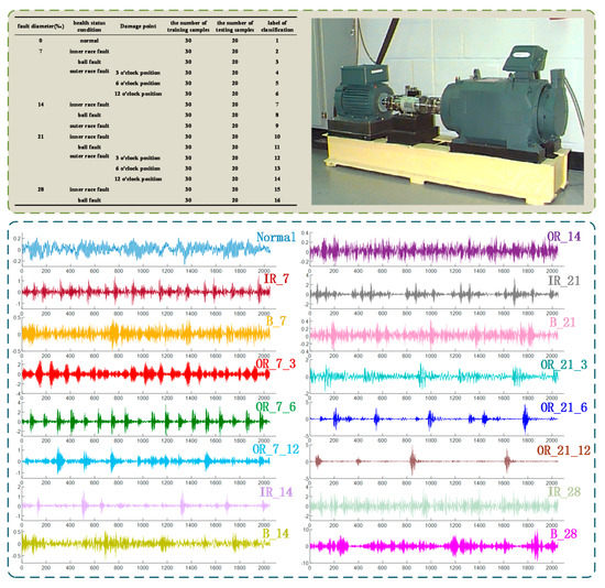 When the motor load is 0 hp and the speed is 1797 r/min, the bearing vibration data for analysis is obtained. The vibration signals of 16 different types of failures, severity and damage points are analyzed. Fifty groups of vibration signals of each state are selected, including 30 groups of training samples and 20 groups of test samples. Each sample is composed of 2048 time series points. The information of bearing vibration data is shown in Figure 5.