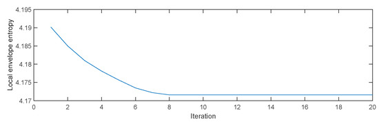 Taking the inner ring fault signal with a fault severity of 7‰ as an example, the multi-island genetic algorithm is used to search for the optimal parameter combination of VMD. The curve of local envelope entropy changing with the number of iterations is shown in Figure 6. Figure 6 shows that the minimum local envelope entropy of 4.1716 appeared in the eighth iteration and has been converging since then, indicating that the optimization algorithm converges fast and has strong global optimization capabilities, and is suitable for searching for the optimal parameter combination of VMD. At the minimum value of 4.1716, the corresponding parameter combination [] is [10,151]. This parameter combination is introduced into the parameter settings of the VMD algorithm. Figure 7 shows the time domain waveform and spectrum of 10 IMF components after the inner ring fault signal with a fault severity of 7 ‰ is decomposed by VMD.