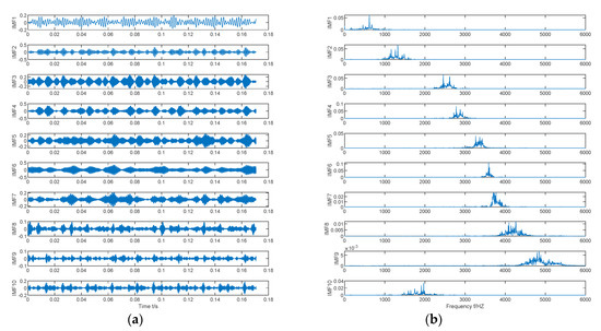 Waveform and spectrum of 10 IMF components. (a) Time domain, (b) FFT spectrum.