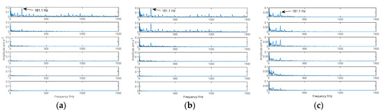 In order to highlight the ability of the MIGA-VMD method to capture fault features, the fault signal is decomposed by EMD, EEMD, and MIGA-VMD respectively, and the Teager energy operator envelope demodulation is performed on the six IMF components that have a greater correlation with the original signal. Take the inner ring fault signal with a fault severity of 7‰ as an example, as shown in Figure 8, where the inner ring fault frequency is 161.1 Hz.