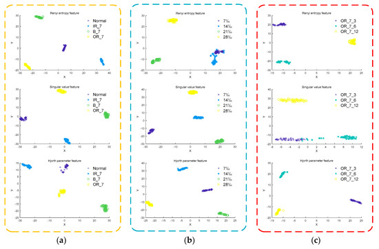 Extract the Renyi entropy feature, singular value feature, and Hjorth feature from the normal signal of the rolling bearing and the fault signal of the inner ring, ball and outer ring under the fault diameter of 7‰, respectively, and use t-SNE for dimensionality reduction visualization, as shown in Figure 9a. Extract the Renyi entropy feature, singular value feature, and Hjorth parameter feature from the inner ring fault signals of different severity, and use t-SNE for dimensionality reduction visualization, as shown in Figure 9b. The Renyi entropy feature, the singular value feature, and the Hjorth parameter feature are extracted from the outer ring fault signals of different damage points, and use t-SNE for dimensionality reduction visualization, as shown in Figure 9c.