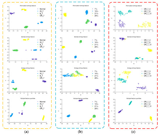 It can be seen from Figure 10a that the energy entropy feature and multi-features extracted from the bearing vibration signals of different fault types have better inter-class separation and intra-class aggregation effects than permutation entropy feature and sample entropy feature. It can be seen from Figure 10b that the sample entropy feature and multi-features extracted from bearing vibration signals of different severity levels have better inter-class separation and intra-class aggregation effects than permutation entropy feature and energy entropy feature. It can be seen from Figure 10c that the permutation entropy feature and multi-features extracted from bearing vibration signals at different damage points have better inter-class separation and intra-class aggregation effects than sample entropy feature and energy entropy feature. In summary, multi-features have better inter-class separation and intra-class aggregation effects from three perspectives of different fault types, different severity levels, and different damage points. Compared with the permutation entropy feature, sample entropy feature, and energy entropy feature, multi-features can more accurately characterize the fault information of the bearing signal.