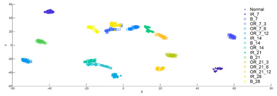 The MIGA-VMD method is used to decompose 16 different bearing vibration signals, multi-features are extracted and dimensionality reduction visualization is performed through t-SNE, as shown in Figure 11.