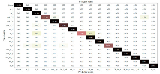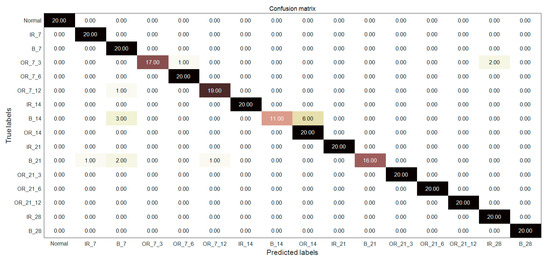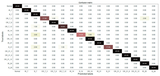 In order to further verify the superiority of MIGA-VMD decomposition and multi-feature feature extraction methods, the fault classifiers in literature [23,24,25] are used to diagnose and identify 16 bearing signals. Figure 12, Figure 13 and Figure 14 and Table 3 shows the fault diagnosis results of the method proposed in this paper with three classifiers, and compared with three documents. Reference [23] proposed a fault classification method. Four kinds of bearing vibration signals were decomposed by EMD, Hjorth parameters were extracted as feature vectors, and a rule-based classifier was used to classify the vibration signals. The classification accuracy is 93.82%. Reference [24] extracts the statistical features of seven bearing vibration signals and the energy entropy features of the IMF components after EMD decomposition, and uses ANN to classify the vibration signals. The classification accuracy is 93%. Reference [25] extracts 37 features in time domain, frequency domain, and time-frequency domain from 12 kinds of bearing vibration signals, and uses PSO-SVM to classify the vibration signals with a classification accuracy of 93.33%.