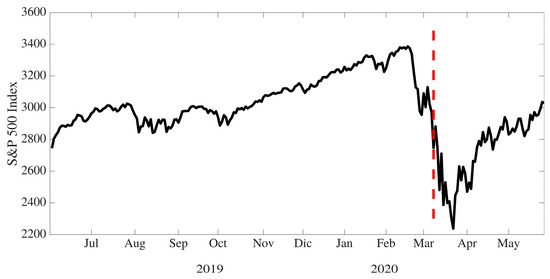 In this research, world stock market indexes are used to evaluate the evolution and performance of the economies of different countries during the periods both before and after the declaration of the global health crisis produced by the spread of COVID-19 [33,36], which can be considered as a shock event. As an example of structural breakdown associated with stock market indexes, Figure 1 shows the evolution of the S&P500 index, in which a structural breakdown in its price can be observed during the second week of March 2020.