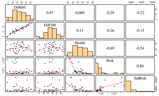 From Figure 2, we detect adequate levels of correlation among the responses Diff3M and Diff6M with the covariates Health, Risk, and StdRisk, justifying the use of multiple linear regression models. However, when observing the correlations between the covariates Health, Risk, StdRisk, we assess a possible multicollinearity problem, which must be analyzed by means of the variance inflation factor (VIF). Its values for each estimated coefficient when modeling Diff3M are: VIF(Health) = 1.93, VIF(Risk) = 5.27, and VIF(StdRisk) = 3.91, whereas when modeling Diff6M, similar values are obtained. Note that all of the VIF values are less than 10, indicating no collinearity problems; see details about the VIF and the used criterion in [44].