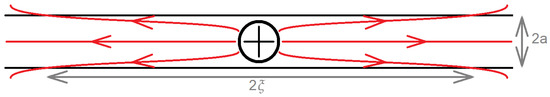 Transport of ions through narrow channels plays a big role in many biological and technological systems. Many pathogens attack cells by forming nanopores in the cell membrane by using pore-forming toxins (PFTs) [1,2]. This punches holes in the cell membrane through which ions diffuse to the outside, effectively killing the cell. Physically this is similar to artificial nanopores in, e.g., silicon [3,4]. These are heavily used in genetic sequencing techniques where high-throughput of selective transport is the most important factor [5]. Other similar examples include free-standing silicon nanowires [6,7] and water-filled nanotubes [8,9]. These systems play various different roles in biology and technology. However they all follow the same underlying physics of a quasi-1D statistical system formed by ions confined to move in a narrow water-filled tube inside a lipid membrane or solid medium [10,11,12,13,14,15,16]. What makes this system special is the large ratio between the dielectric constants of water, , and the surrounding media (e.g., for lipids or silicon oxide ). Because of this, the electric field created by an ion within is confined to stay mostly inside the water-filled channel and does not leak into the surrounding medium. As several numerical simulations in three dimensions point out the flow field also follows almost entirely the channel direction [17,18,19]. This simple observation has profound consequences.