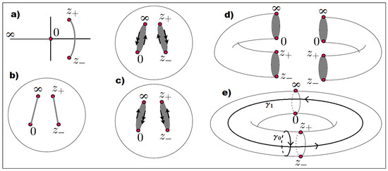 Construction of the Riemann surface of genus 1, as defined by Equation (15). (a) In the z-plane there are four branch points at which are pairwise connected by two branch cuts (gray). (b) Considering as a regular point the complex plane compactifies to a Riemann sphere with two cuts on the sphere. (c) The double-valued nature of the function is resolved by defining two copies of the Riemann sphere. The branch cuts are opened and the spheres are deformed into tubes (d) and glued together to form a torus (e). The arrows are used to signify the edges that are glued together. There are two fundamental cycles which are topologically different and non-trivial, i.e., they can not be smoothly transformed into each other or a point. Reproduced with permission from Reference [26].