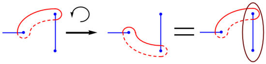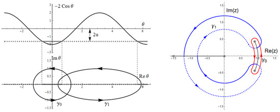 More can be said when considering the analytic structure of the classical and instanton action in a vicinity of . Therefore we use a concept called monodromy [29,32], which is visualized in Figure 7. We choose some and allow u to wind around (i.e., ). The two branch points inside the cycle in Figure 5 are exchanged by this transformation via a counter-clockwise half-turn; the branch cut in effect rotates by . For this has no effect, the cut turns within it. Not so for : if this cycle is never to intersect the branch points, it is continuously deformed and as a result of this monodromy transformation we obtain , thus picks up a contribution of . This effect is visualized in Figure 7. While we have returned to the initial value of u, the period does not return to its original value and thus can’t be analytic. This occurs for every monodromy cycle near . The only function which monotonically increases as the phase of its argument grows is the complex logarithm. Thus, must have a logarithmic dependence on . One can check that