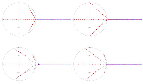 The bands of the non-Hermitian Hamiltonian in space of complex energy u. Blue stands for , while red stands for . The dotted circle marks . In all cases we see multiple branches of narrow bands with complex values which terminate near the unit circle. The dashed line is a guide to the eye which connects the termination points of the branches, , to . Top left: , ; top right: , ; bottom left: , ; bottom right: , . Reproduced with permission from References [25,26].