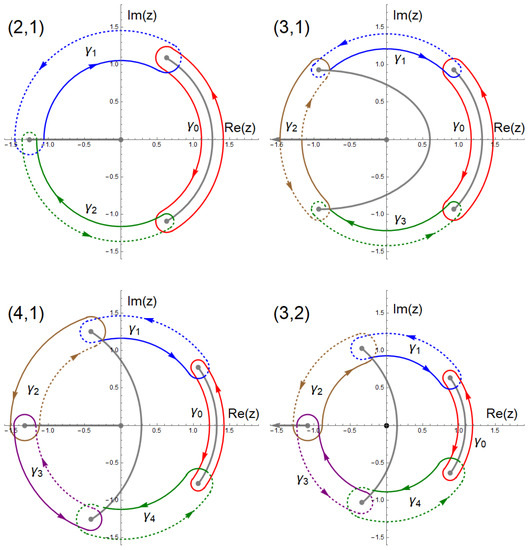In Figure 5 we show the structure of branch points in the z-plane for these four cases. On a Riemann surface with genus there are two (four) independent closed cycles [29]. In Figure 5 we define three cycles for the case, and five cycles for and . This is done for convenience and symmetry reasons. The superfluous cycle can be expressed by the other cycles. For the linear combination does not contain any of the branch points and is contractible to a point. For the trivial cycle is , and for we see that . We choose to include the additional cycle because it gives an easy representation for the symmetry relation between the corresponding actions , akin to Equation (23). By substituting and the cycles transform . For the case the resulting symmetry relation is