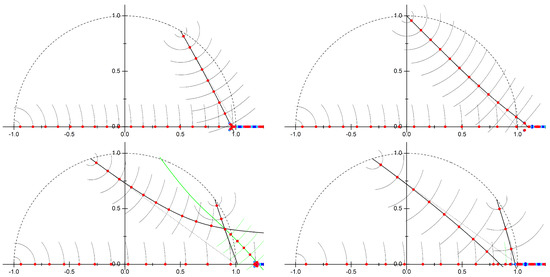 Narrow energy bands (red dots) in the upper half-plane of complex energy u for large , cf. Figure 4. In all four cases, along the real axis, where the thin lines mark , the quantization condition. The other black lines mark for the other actions , and the thin lines mark . In all cases corresponds to an action encircling two branch points. These points coalesce at a singular value of u on the unit circle (dashed) where the spectral branch ends. Near intersections of two lines neither quantization condition holds, cf. in and in . Beyond this intersection the states are quantized according to the sum of the two corresponding actions, in and in , marked in green. To the right all lines coalesce and beyond this point we observe wide bands with narrow gaps. The lower half-plane shows the mirror image (i.e., complex conjugate) of the upper half plane. Top left: , ; top right: , ; bottom left: , ; bottom right: , . Reproduced with permission from Reference [26].