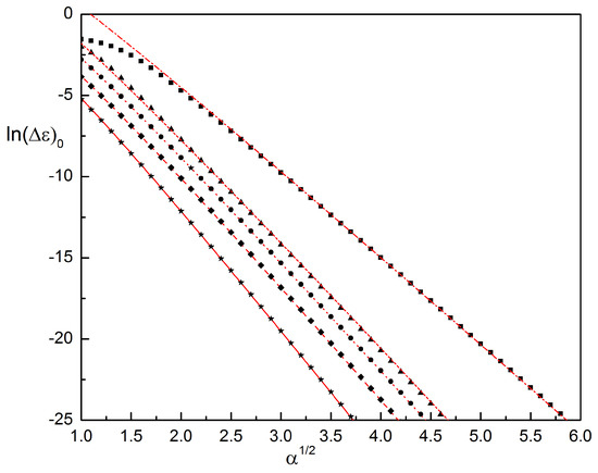 Analytic (numerical) results for the logarithm of the bandwidth of the lowest band, , as a function of , for all five cases with Riemann surfaces of genus 1 or 2. : solid line (stars), : dashed line (diamonds), : dotted line (circles), : short-dashed line (triangles), and : dash-dotted line (squares). Reproduced with permission from Reference [26].
