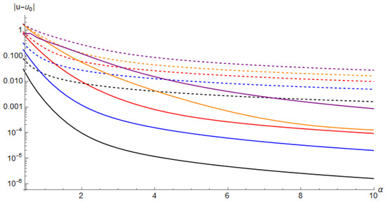 Log-plot of the deviation of the first-order (dashed line) and second-order (solid line) WKB result from the exact numerical result for the lowest eigenvalue as a function of . We show the five different cases: in black, in blue, in red, in orange, in purple. The error drops by several orders of magnitude when taking the second-order WKB term into account. The approximations converge to the exact result as ; however, already at moderate values of the approximations give quite accurate results.
