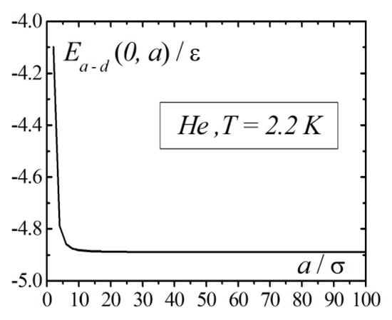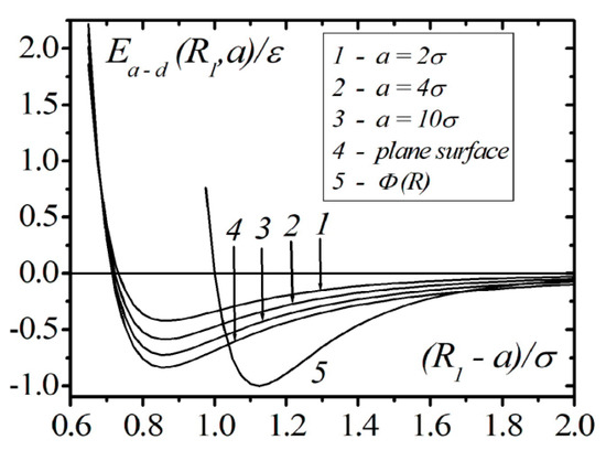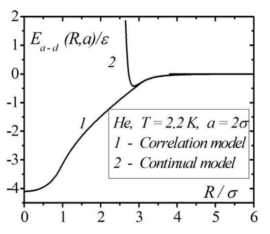 Figure 2 shows the results of calculations in continual approximation using Formula (13) for the interaction energy of an atom with a droplet of liquid helium for different values of droplet radius (curves 1–3) and a semi-bounded liquid (curve 4). The interaction energy of the pair of atoms, which is described by the Lennard–Jones potential (curve 5), is also shown. The calculations show that the position of the minimum of the interaction energy of an atom with droplets and semi-bounded liquids is significantly shifted to the shorter distances in comparison to the interatomic potential . The depth of the potential well increases with the growth of the droplet radius and reaches saturation for the flat interface of the liquid. At a given density of the liquid, the depth of the potential well, even in the case of atom interaction with the flat interface, is less than in the case of atom–atom interaction. In the case of continual approximation, the interaction energy of the atom with its surroundings approaches infinity when an atom approaches a surface, i.e., the atom cannot reach the surface of the liquid. This result is not satisfactory for a liquid; however, to a certain level, it is acceptable for the modeling of atom interaction with a solid body, and it is used in absorption problems. The main disadvantage of the continuum approximation is complete neglect of the discrete surrounding structure effects and correlations between separate atoms with the surrounding atoms.