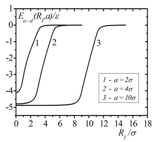 The goal of the current section is to present the model calculations of the interaction energy between the atoms and nanodroplets of a simple liquid. The foundation of these calculations is based on the expression for the energy of an inhomogeneous liquid within the framework of the distribution function method of groups of particles, which takes into account all paired interatomic interactions and correlations. The paired interatomic interactions were described using the Lennard–Jones potential. The structure of the droplets was modeled using a Fowler approximation (the step profile of atoms’ density in the droplets) [18,19]. The calculations are performed for the cases in which the atom is located outside, inside, and on the surface of the droplet. For the geometry dispositions of the atom and droplet, which require accounting for the paired interatomic correlations, pair distribution functions within the framework of thermodynamic perturbation theory were used.