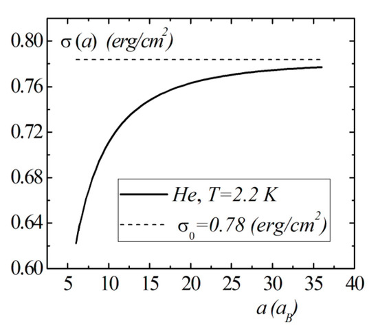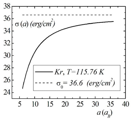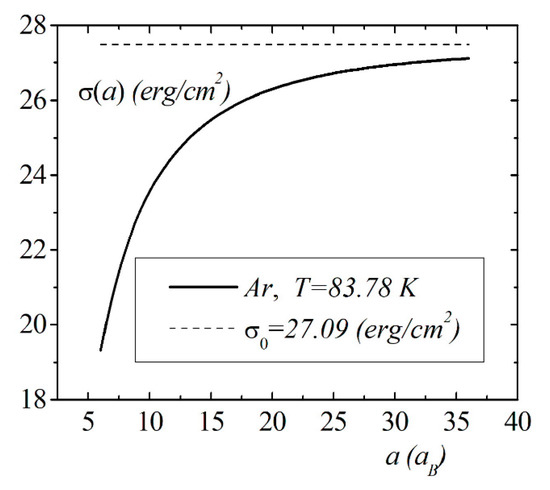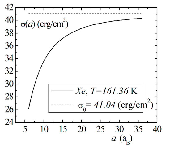 Model calculations of the dimensional dependence of the surface energy of gases , , are presented in Figure 8, Figure 9 and Figure 10. The parameters of Lennard–Jones potentials are taken from a monograph [13]. Model calculations for all elements are performed for temperatures and densities corresponding to triple points. Note the similarity of the dimensional dependences of for the selected group of elements. The surface energy shows a strong dependence for nanosized droplets. With an increase in size, the surface energy of nanodroplet approaches the value of the surface energy of a flat surface .