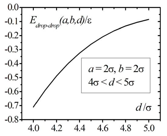 Let us assume that the center of the second droplet with radius is located along at a point with coordinate Then, the interaction energy of these two droplets with center distances , using (52), can be written as: