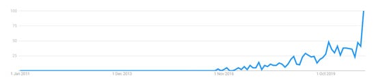 Google Trends Popularity Index (Max value is 100) of the term “Explainable AI” over the last ten years (2011–2020).
