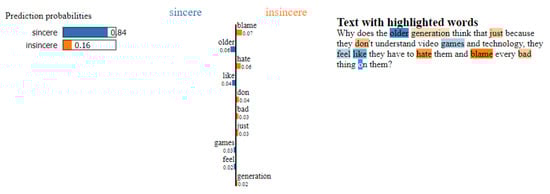 This section focuses on interpretability techniques, which can be applied to any black-box model. First introduced in [45], the local interpretable model-agnostic explanations (LIME) method is one of the most popular interpretability methods for black-box models. Following a simple yet powerful approach, LIME can generate interpretations for single prediction scores produced by any classifier. For any given instance and its corresponding prediction, simulated randomly-sampled data around the neighbourhood of input instance, for which the prediction was produced, are generated. Subsequently, while using the model in question, new predictions are made for generated instances and weighted by their proximity to the input instance. Lastly, a simple, interpretable model, such as a decision tree, is trained on this newly-created dataset of perturbed instances. By interpreting this local model, the initial black box model is consequently interpreted. Although LIME is powerful and straightforward, it has its drawbacks. In 2020, the first theoretical analysis of LIME [46] was published, validating the significance and meaningfulness of LIME, but also proving that poor choices in terms of parameters could lead LIME to missing out on important features. Figure 4 illustrates the application of the LIME method, in order to explain the rationale behind the classification of an instance of the Quora Insincere Questions Dataset.