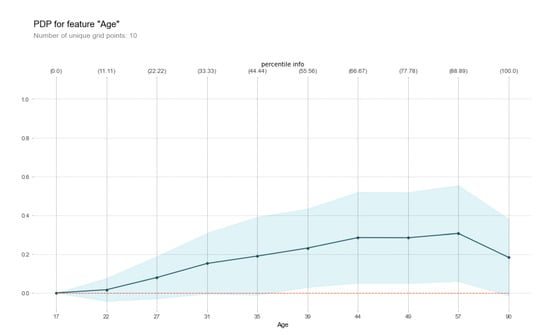 Friedman [59] proposed PDPs, a visualisation tool that helps to interpret any black box predictive model by plotting the impact of specific features or subsets of features on a the model’s predictions. More specifically, PDPs show how a certain set of features affects the average predicted value by marginalizing the rest of the features (its complement feature set) out. PDPs are usually very simplistic and they do not take all the different feature interactions into account. As a result, most of the time they cannot provide a very accurate approximation of the true functional relationships between the dependent and independent variables. However, they can often reveal useful information, thus greatly assisting in interpreting black box models, especially in cases where most of these interactions are of low order. Although primarily used to identify the partial relationship between a set of given features and the corresponding predicted value, PDPs can also provide visualisations for both single and multi-class problems, as well as for the interactions between features. In Figure 5, the PDP of a Random Forest model is presented, illustrating the relationship between age (feature) and income percentile (label) while using the Census Income dataset (UCI Machine Learning Repository).