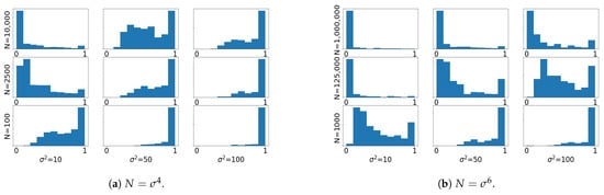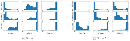 To illustrate the behavior of importance sampling in small noise regimes, we first introduce a motivating numerical study. A similar numerical setup was used in [13] to demonstrate the curse of dimension of importance sampling. We consider the inverse problem setting in Equation (9) with and noise covariance We conduct 18 numerical experiments with a fixed data y. For each experiment, we perform importance sampling 400 times and report in Figure 1 a histogram with the largest autonormalized weight in each of the 400 realizations. The 18 experiments differ in the sample size N and the size of the observation noise In both Figure 1a,b we consider three choices of N (rows) and three choices of (columns). These choices are made so that in Figure 1a it holds that along the bottom-left to top-right diagonal, while in Figure 1b along the same diagonal.